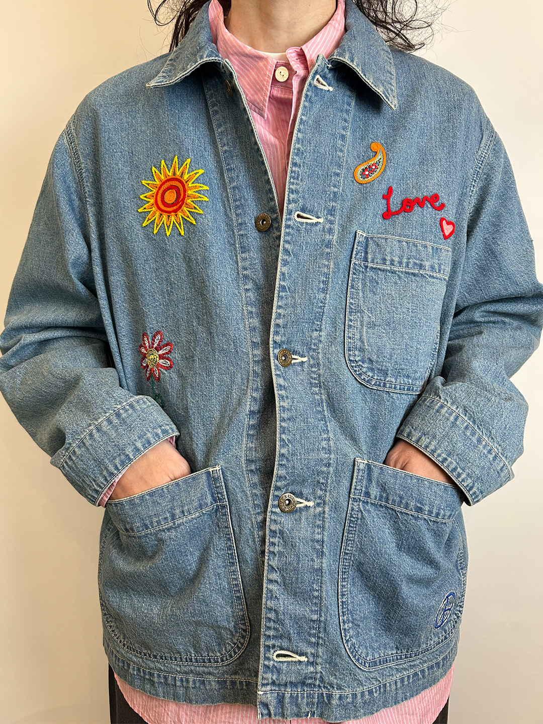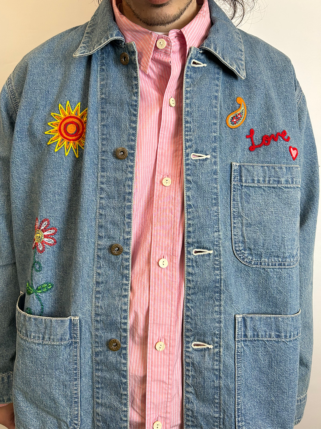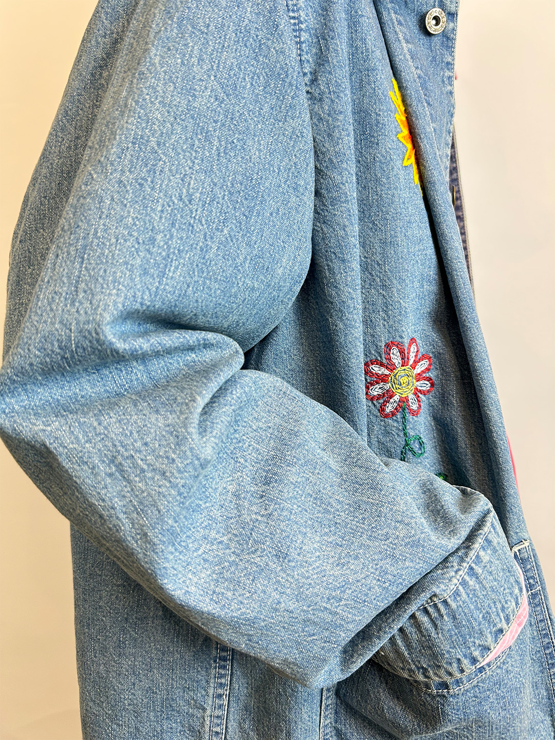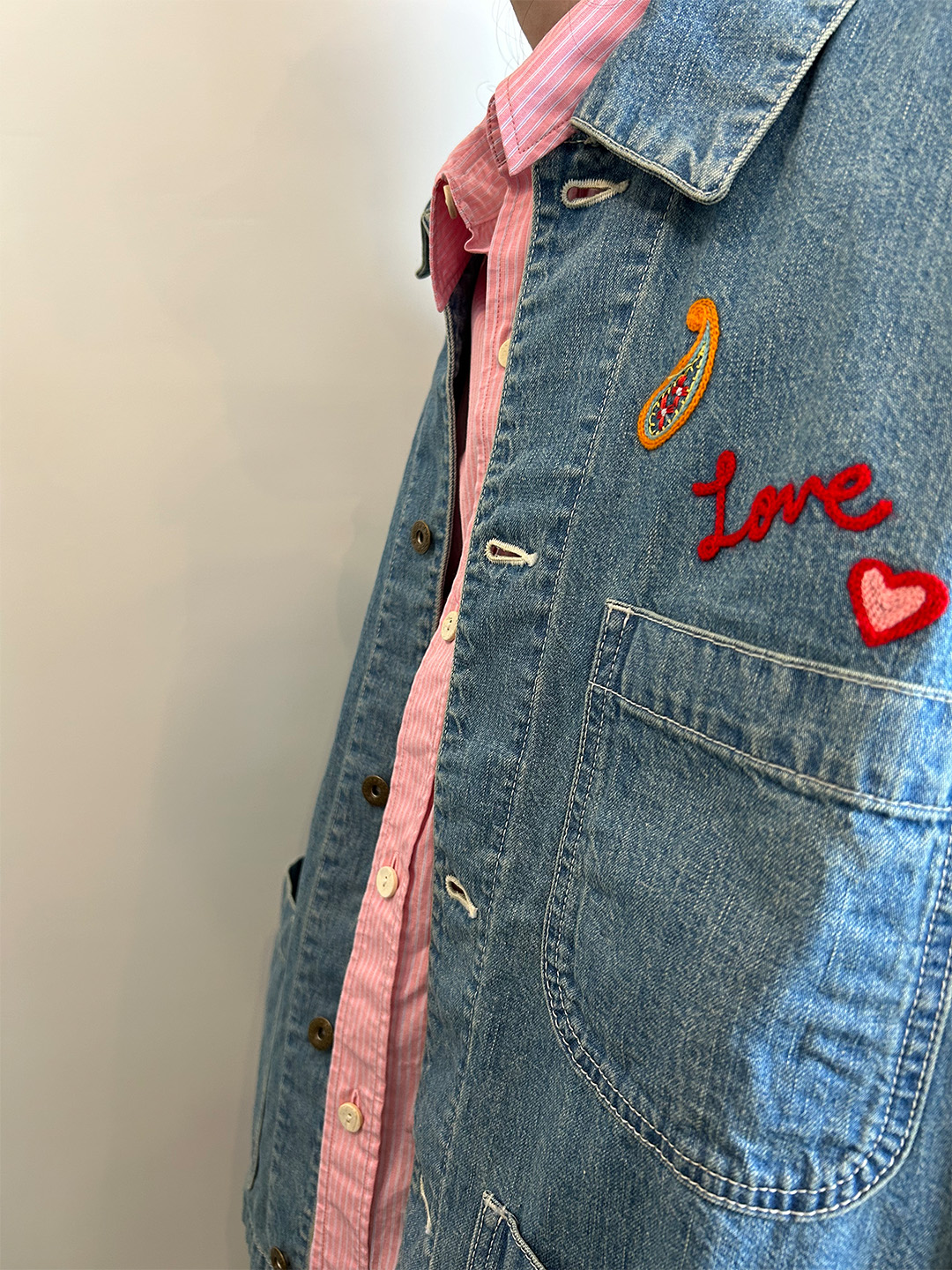 前身には手書き風のさまざまな刺繍を施しています。